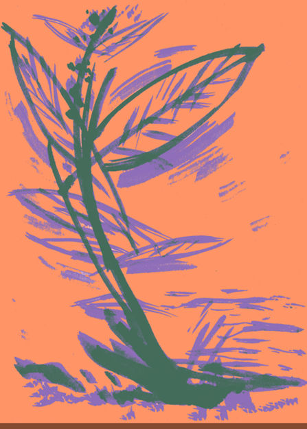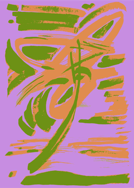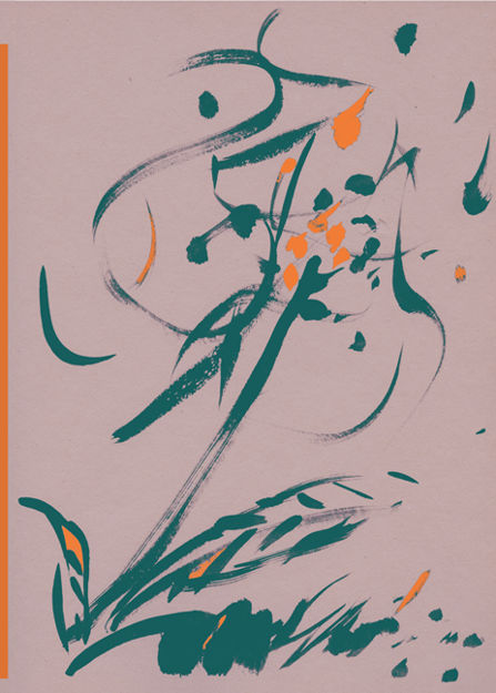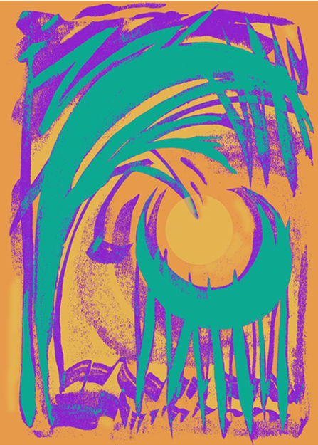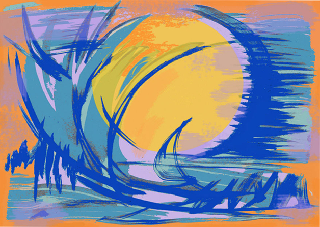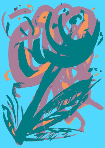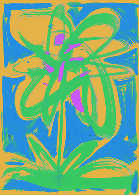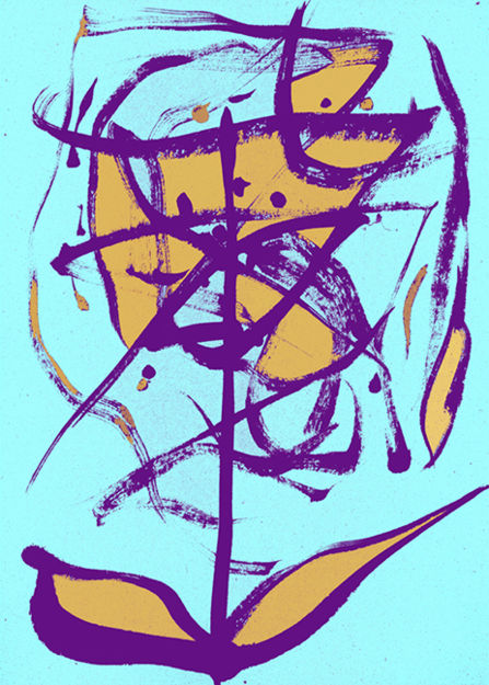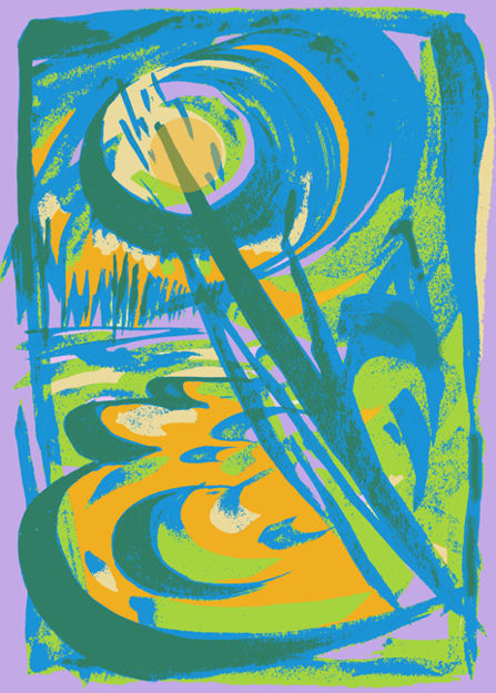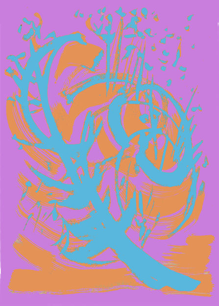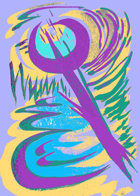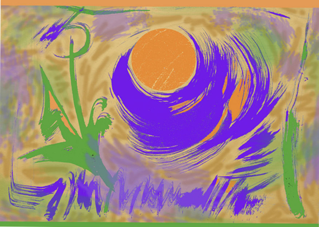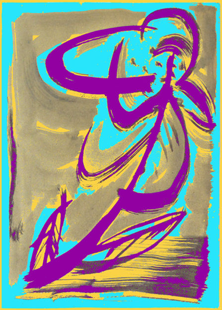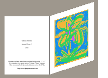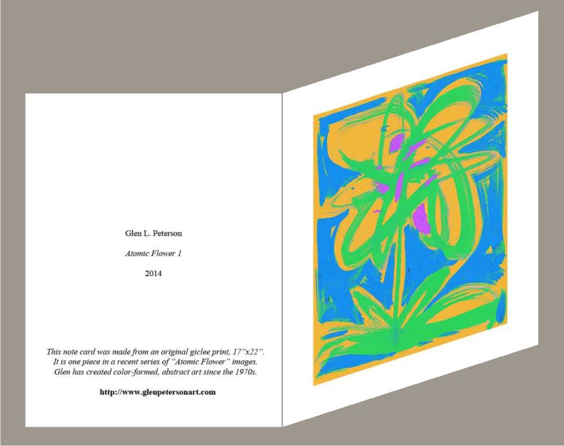 This note card was made from an original giclée print, 17" x 22." It is one piece in a recent series of Atomic Flower images. Glen has created color-formed, abstract art since the 1970s. Web site is shown in bold type.